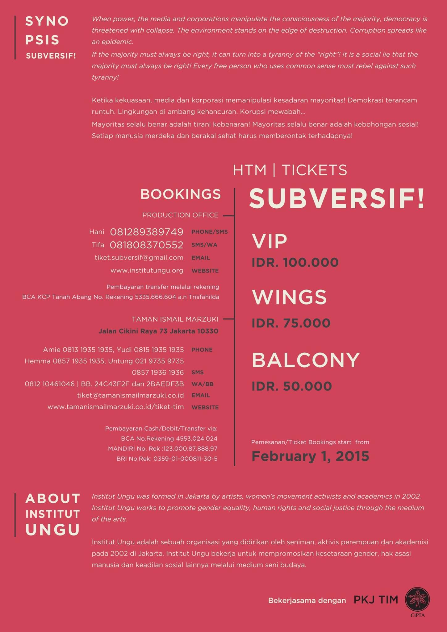 VIP: Rp 100.000, Wings: Rp 75.000, Balcon/UPSTAIRS Rp. 50.000